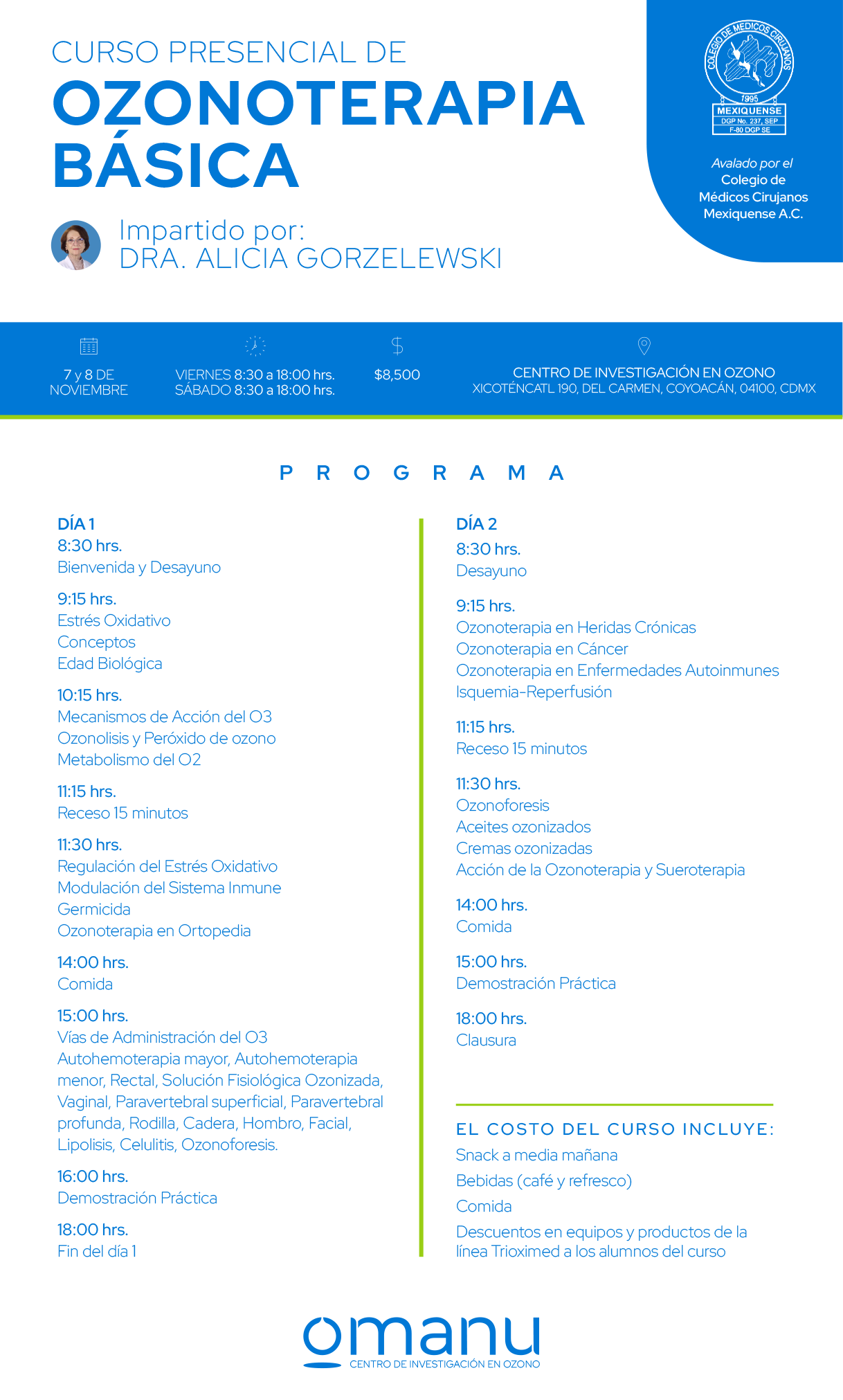 Este curso de ozonoterapia será impartido por la Dra. Alicia Gorzelewski, por lo que te brindará los conocimientos teóricos y prácticos necesarios para aplicarla de manera segura, profesional y con resultados comprobables.